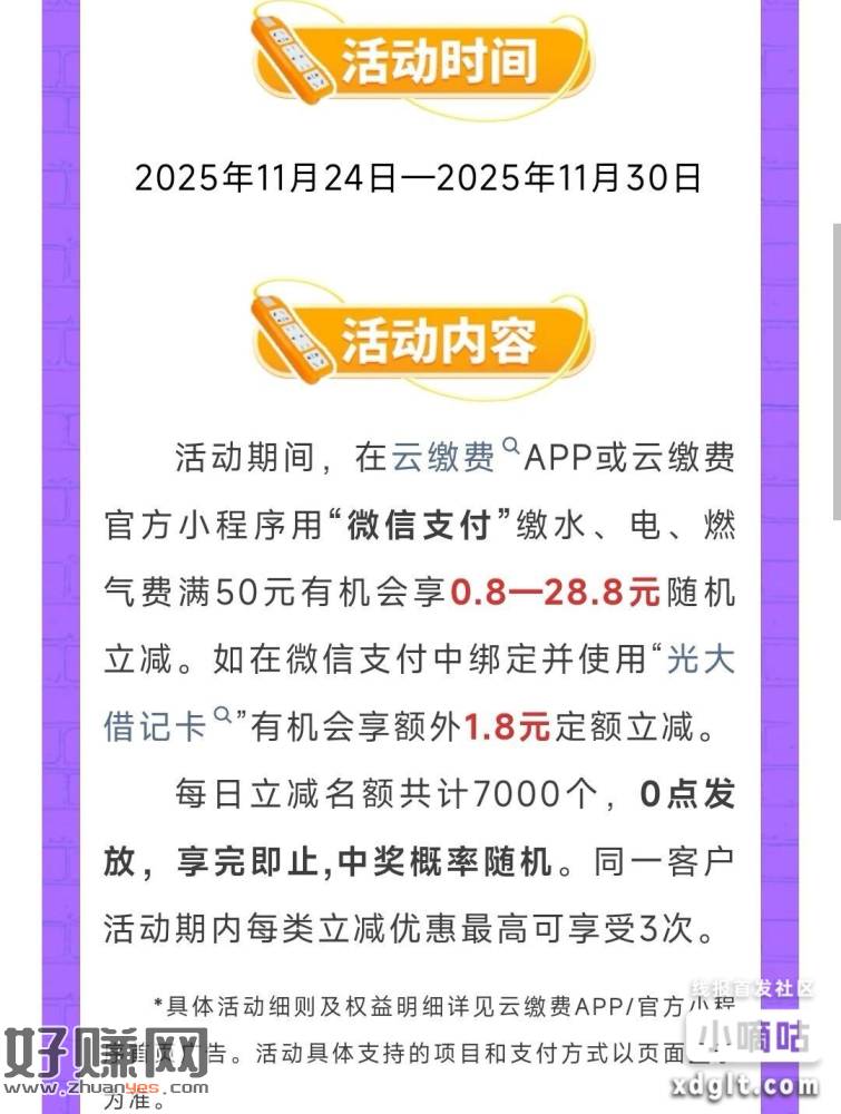 云缴.费 有随机立剪 先到先得 每日7k份名额 11.30截 有需如图看 50减0.8~28.8亓 期间内最高➖3次