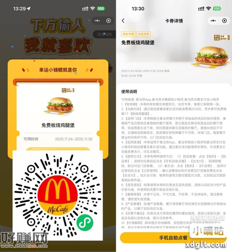 【麦当劳口令领免费板烧鸡腿堡】微信打开活动->输入口令“我就喜欢”领免费板烧堡,需消费满20亓随单使用mp://QuMPzHv3qFzw4pl