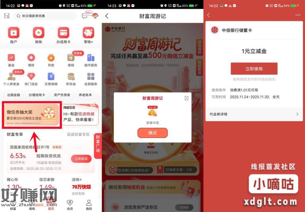 [图片]中信银行抽1-500元微信立减金,注册过二类电子卡的也能去,新一期———打开“中信银行”APP,首页点【做任务抽大奖】进去,完成2个简单的浏览任务抽奖,刚中1元