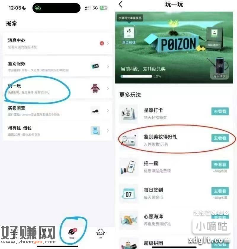 得物αpp下方点探索-玩一玩-进去有鉴别美妆得好礼,然后找一个化妆品去鉴别一下,通过就可以抽实wu,有水。得物没有入口的更新/换号
