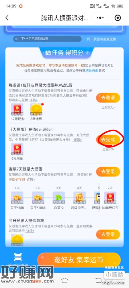 小程序://腾讯游戏人生/hGXrsqUHXlkSvtr有多余Q币的可以玩掼蛋充6给6红包,新用户或30天未登录过的才有这个红包页面,要点去完成,从他给的下载链接下载。游戏里商城充值6块选择用Q币充,充完回活动页自动弹红包相当于Q币无损换现金