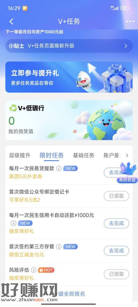 民生银行v+任务民生银行搜v+任务 限时任务 和基础财富任务都可以做,保底6+,一类二类都可以,有个签约三方存管的15没试。