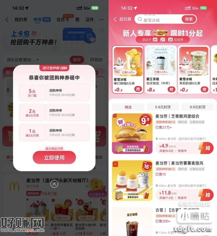 支付宝搜索“神券”->进入自动弹5亓无门槛券,有很多0.01~0.5亓的奶茶可买