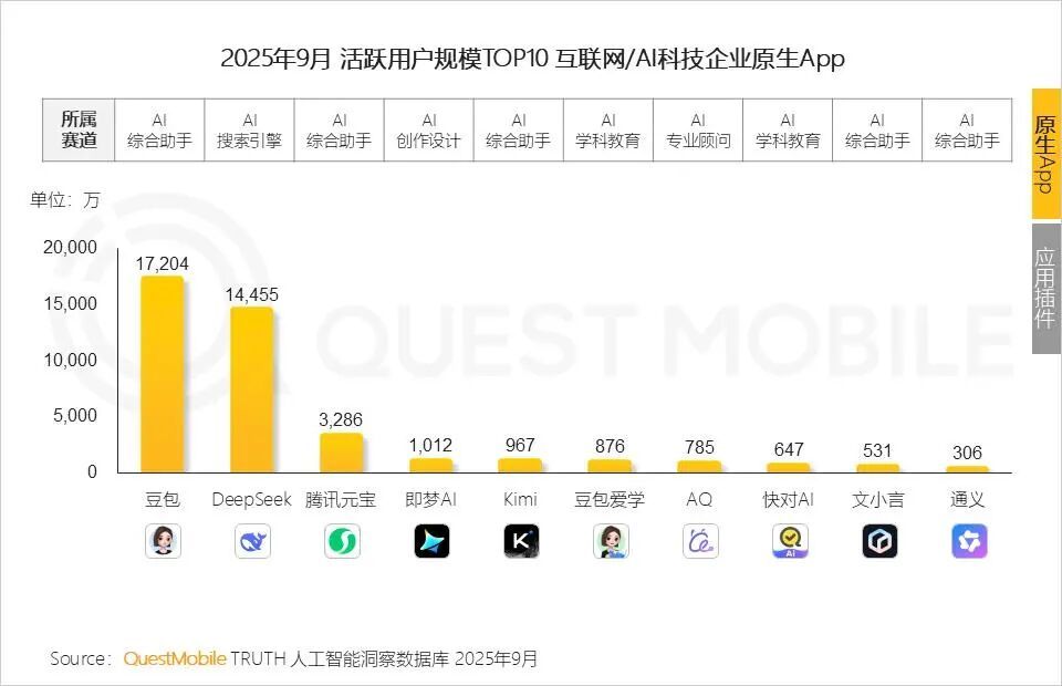 QuestMobile《2025年9月AI原生App榜单》显示,豆包以1.72亿月活稳居第一,DeepSeek以1.45亿月活位列第二——二者合计用户规模接近3.2亿人,几乎相当于中国网民的三分之一。
