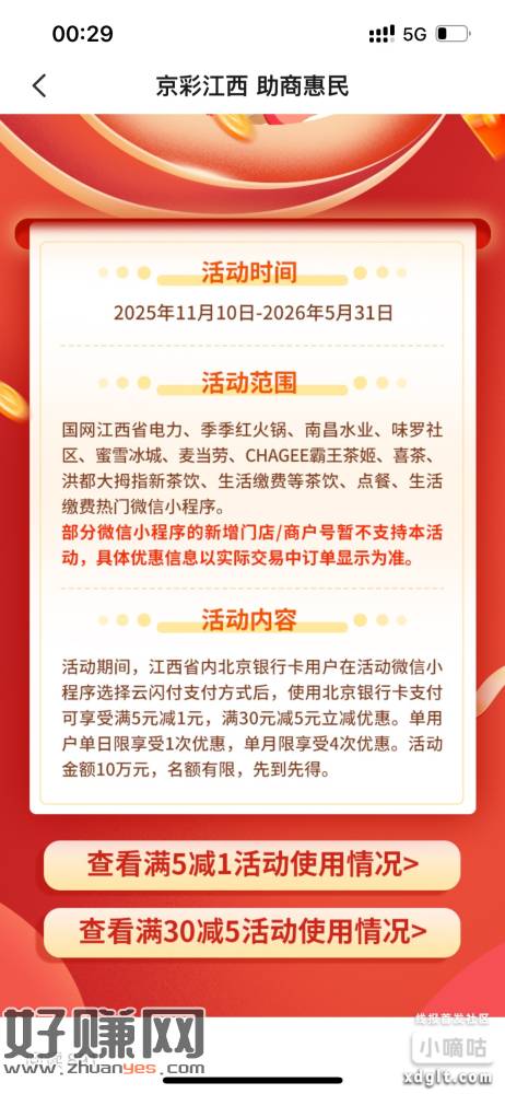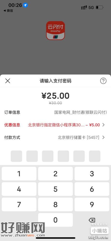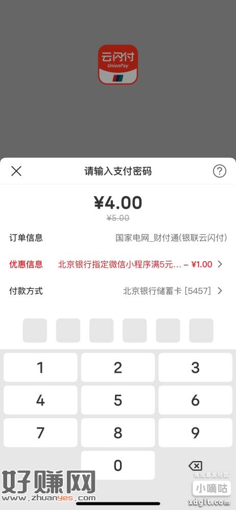 江西的北京银行用微信国网电力小程序,交电费选云闪付,跳转北京银行支付,有5-1和30-5,分别每月4次每日一次