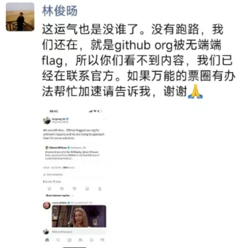 真正让外界认识林俊旸的,是2024年的通义千问(Qwen)。那一年,随着多版本模型相继开源、阿里内部AI团队的重组,以及GitHub风波引发的舆论关注,这位原本低调的技术负责人突然站到了聚光灯下。当Qwen项目代码因误标被GitHub“下架”引发外界质疑时,林俊旸亲自出面回应:“团队没有跑路,我们还在,只是组织账号被误标记。”这句话,比任何公关声明更能说明问题——冷静、克制、真实。