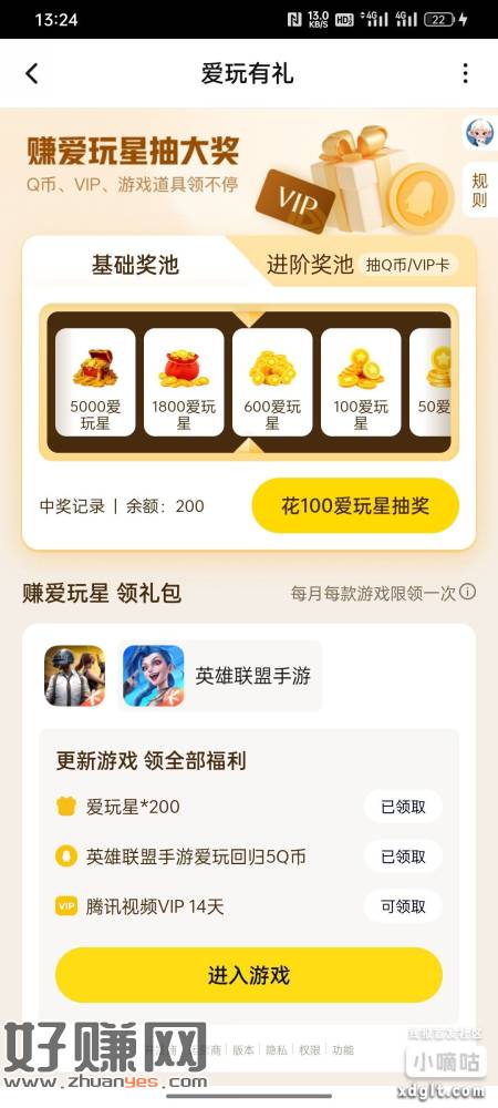 腾讯视频我的→我的游戏→左上爱玩有礼→进去下拉每个游戏都可以玩,下载登录之后返回页面领取资格,等审核48小时后,再返回页面每个游戏可以领5Qb或者腾讯视频半个月(2选1)