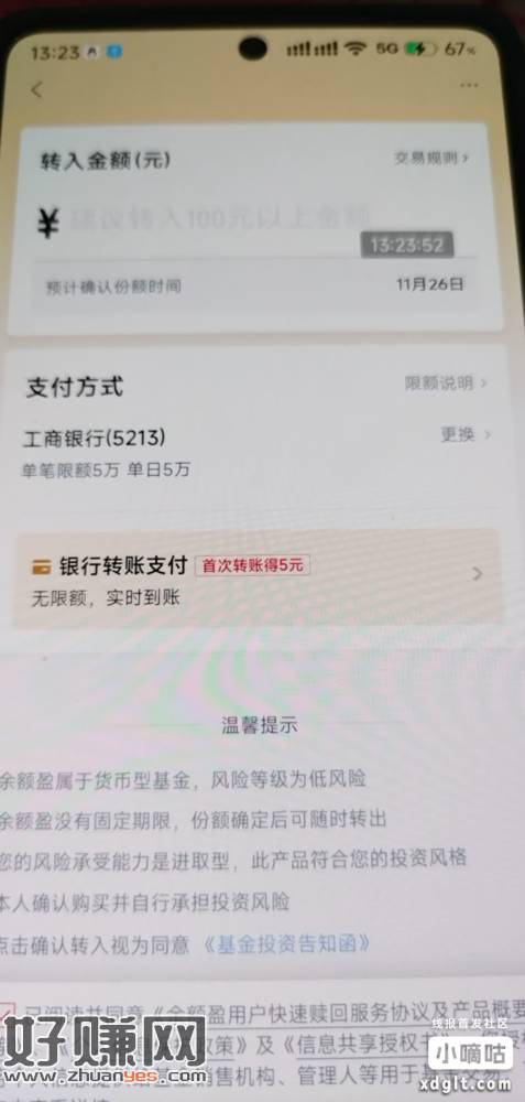 度小满余额盈 转账 进入下面会显示有一个首次转账得5块。