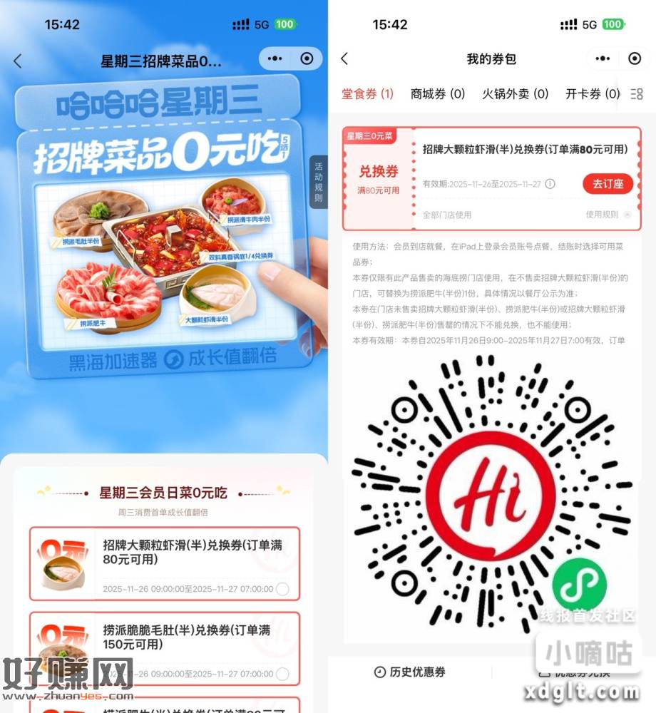 【海底捞领周三半份菜品兑换券】微信打开活动->5选1领半份虾滑/肥牛/毛肚券,限明天11月26日可用,刚好要吃海底捞的可以领下!mp://syCUGz7coaldqfa