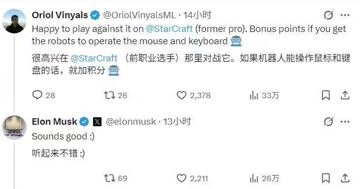 谷歌 DeepMind 研究与深度学习主管、Gemini 联合负责人 Oriol Vinyals 提议,也可以试试比赛《星际争霸》游戏,马斯克则回复称“听起来不错”。