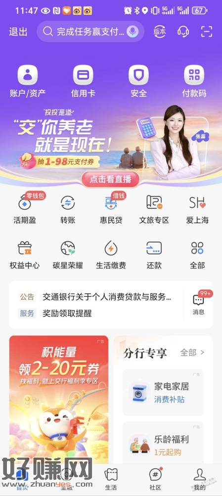 1、交行APP领券中心,各种券上新了2、首页预约直播,交你养老,12点有券