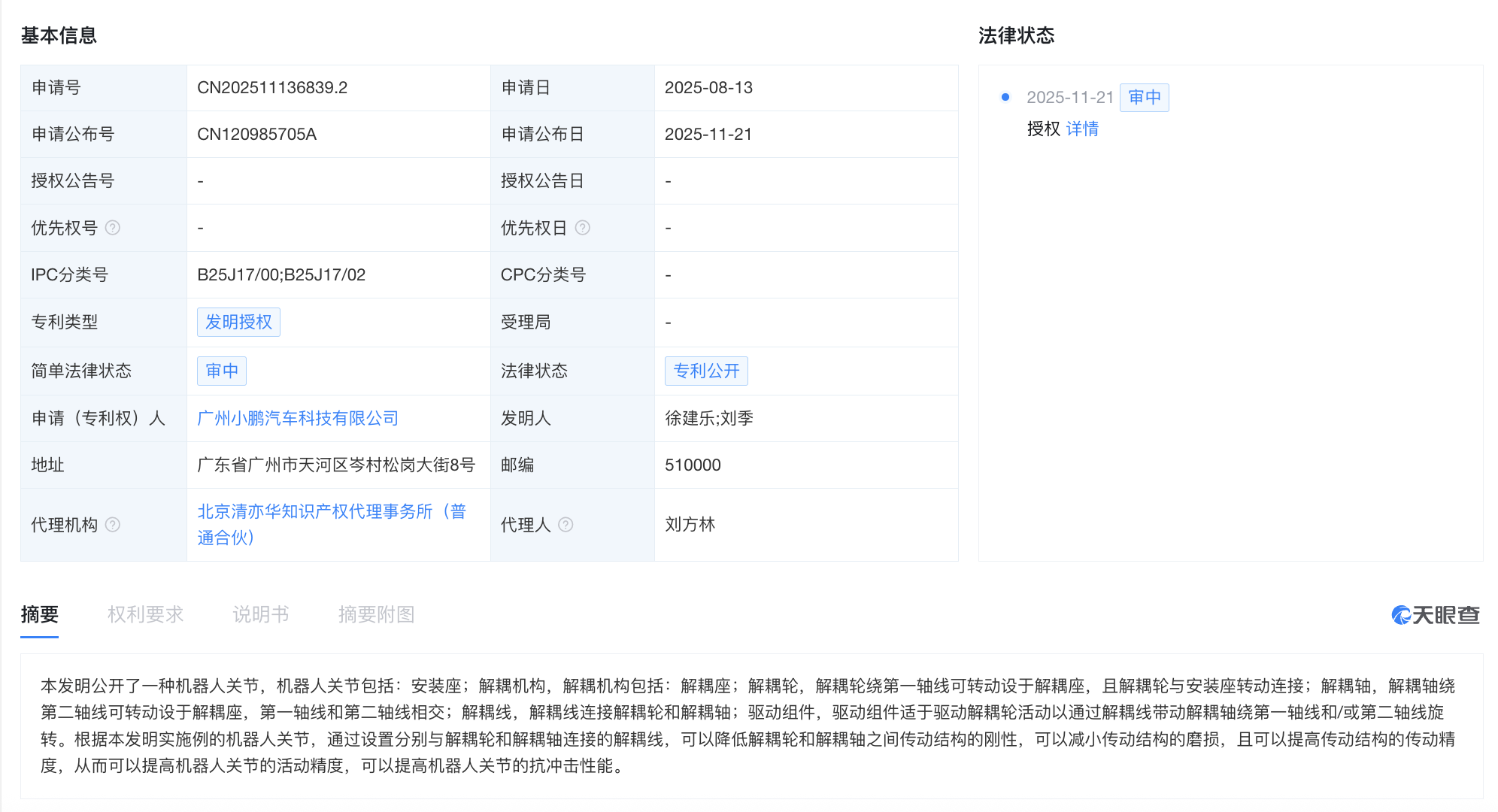 凤凰网科技讯 11月26日,天眼查显示,近日,广州小鹏汽车科技有限公司申请的“机器人关节”专利获授权。