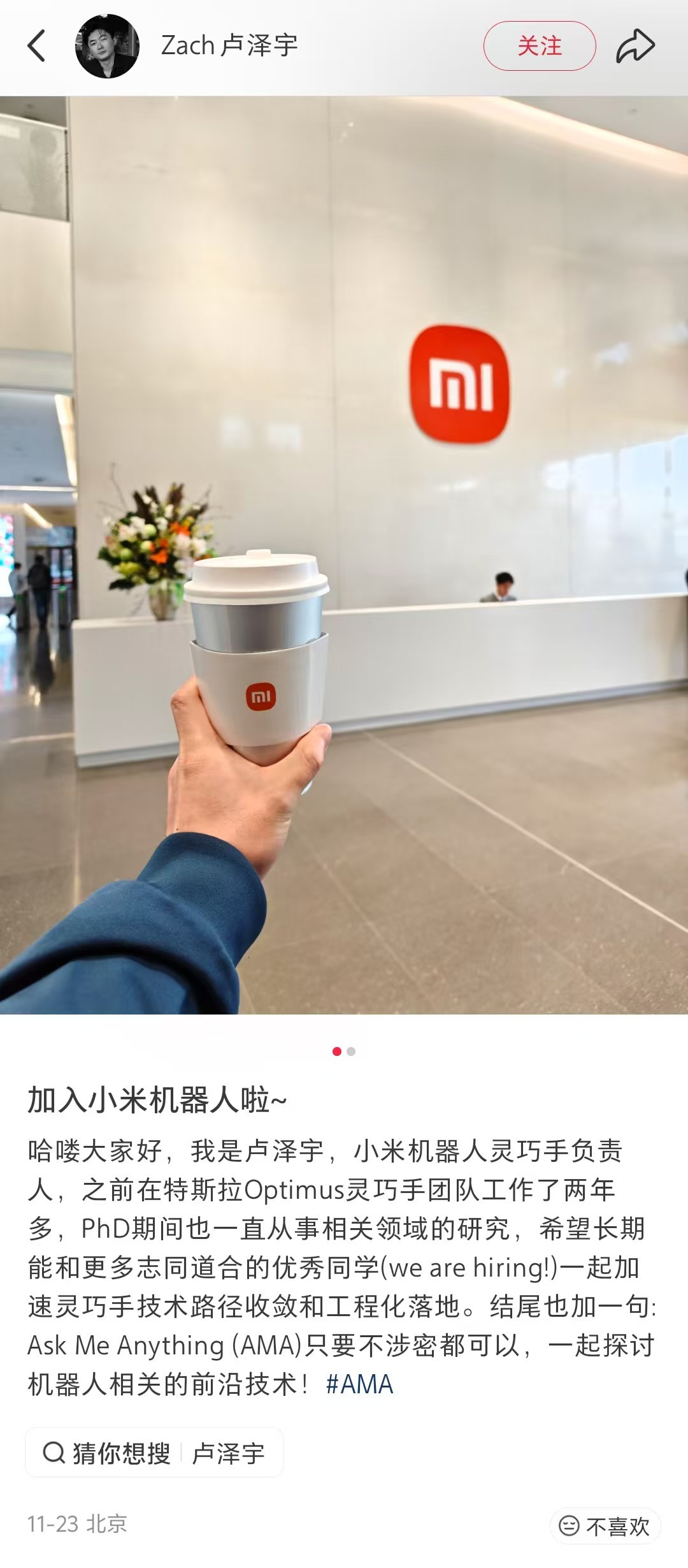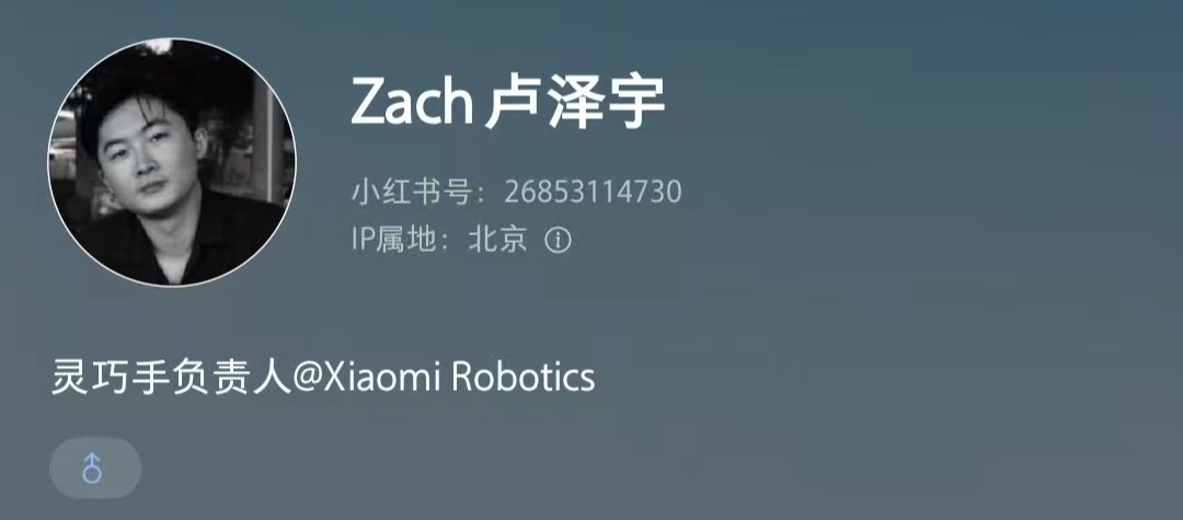 在卢泽宇的个人社交平台上,其自我介绍为小米机器人灵巧手负责人。