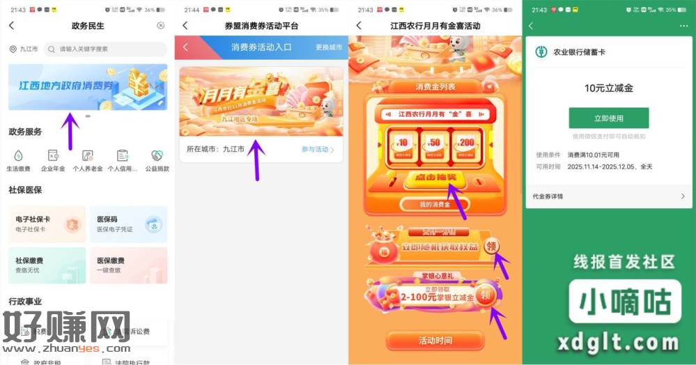 江西农行抽2-100元微信立减金(限地区)———打开“中国农业银行”APP搜索【政务民生】点滚动图【江西地方消费券】进去月月有金喜活动里,里面3个活动都可以去,刚中10元微信立减金,需要江西农行卡才可以