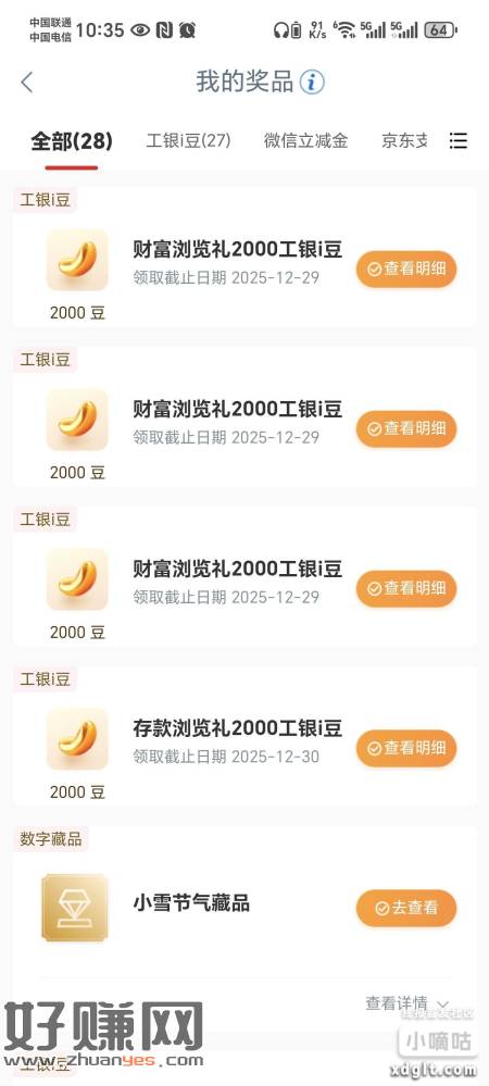 工行任务中心下拉财富浏览礼三次抽奖目前大水3全中共6000豆,速去!