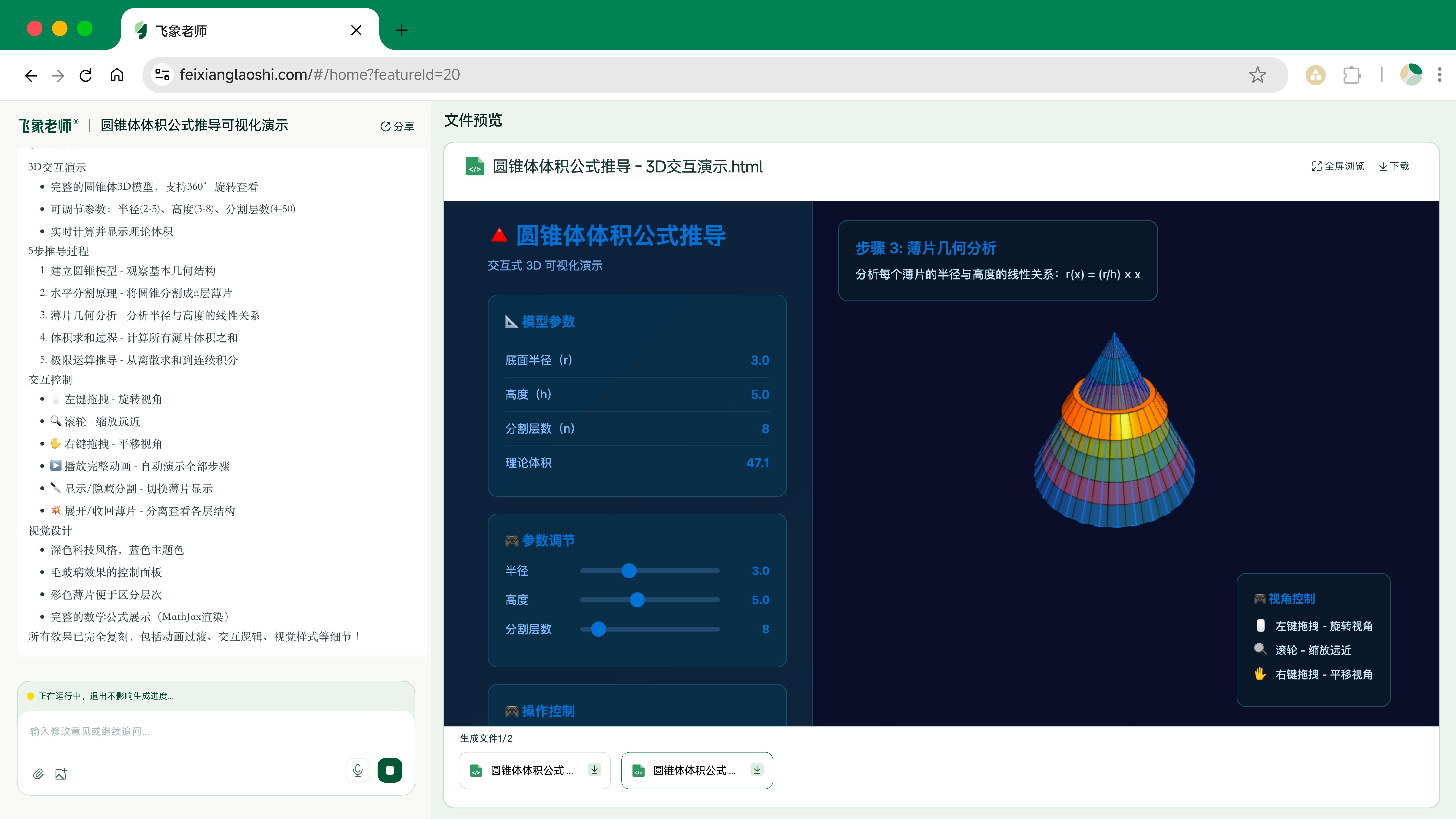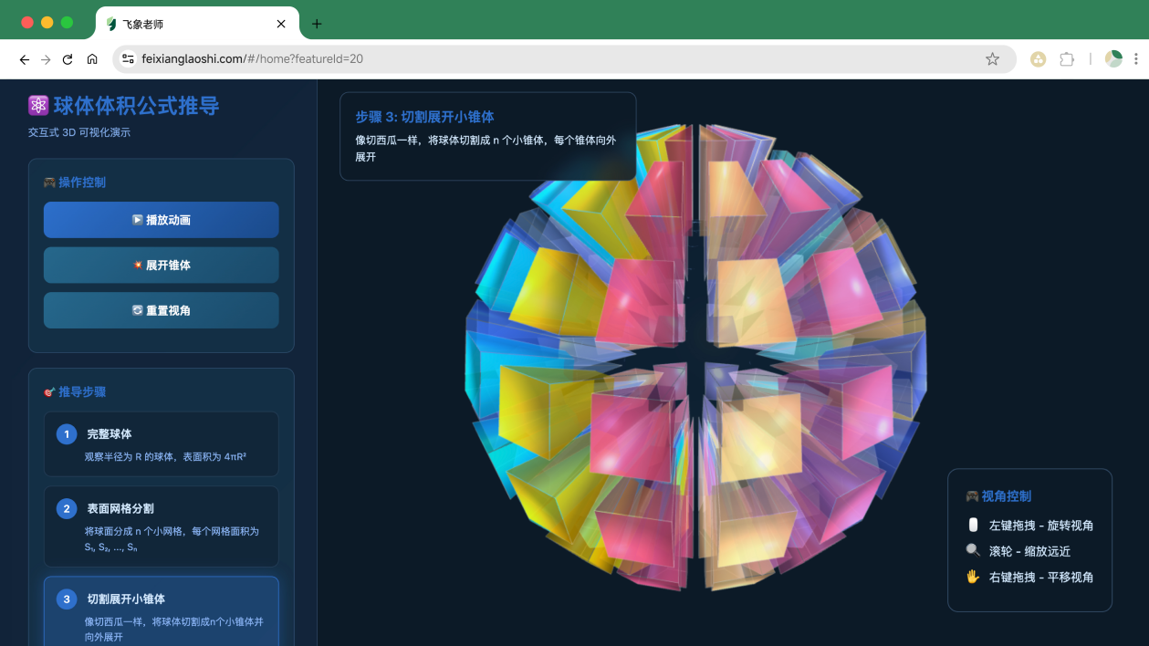 在数学学科,以“球体体积公式推导”为例,教师输入指令后,系统生成的不再是静态视频,而是一个可交互的3D几何演示模型,学生可通过拖拽、旋转来直观探究推导过程;针对“勾股定理”或“立体几何”等抽象难点,也能生成动态的可视化交互课件。