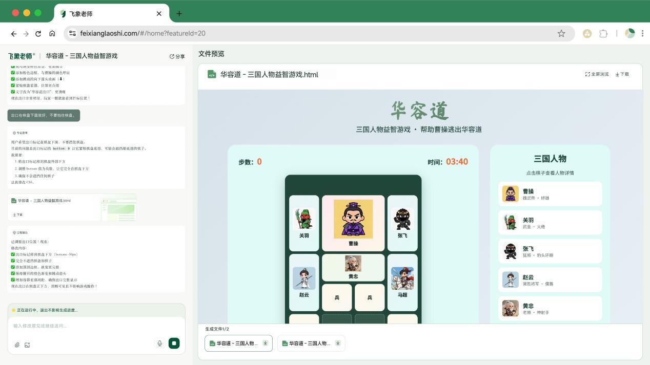 立足中国教师的教学与备课场景,飞象老师有两大亮点:一、支持用户输入任意知识内容并辅以一句教学想法,轻松生成专业级的交互教学动画,如数学中抽象的公式定理,可立即转化为具备3D视效、可交互调整参数的专业演示动画;二、结合用户创意指令,还能自动生成寓教于乐的游戏化课件,瞬间点亮欢乐有趣的课堂。