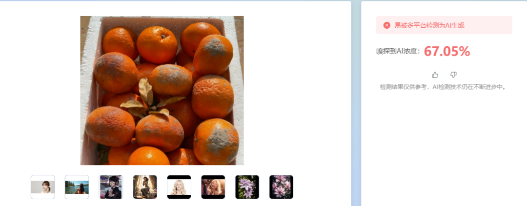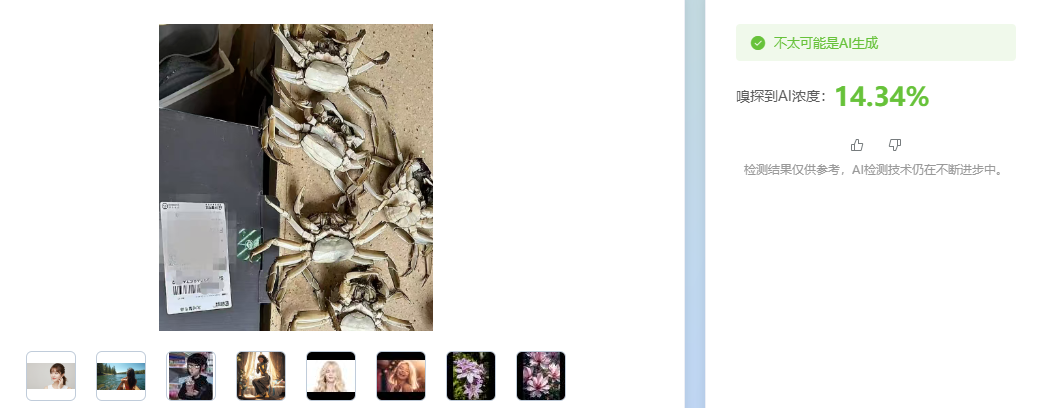 但市面上的AI检测软件也不一定准确,比如死螃蟹图它就没鉴定出来。