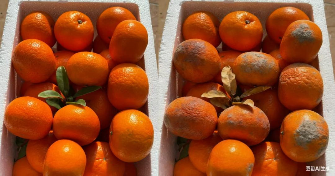 小编让豆包生成的橘子腐烂图,不仅能让新鲜橘子一键变腐烂,还能设定腐烂的时间,同时调整叶子的状态,乍一看确实有点唬人。