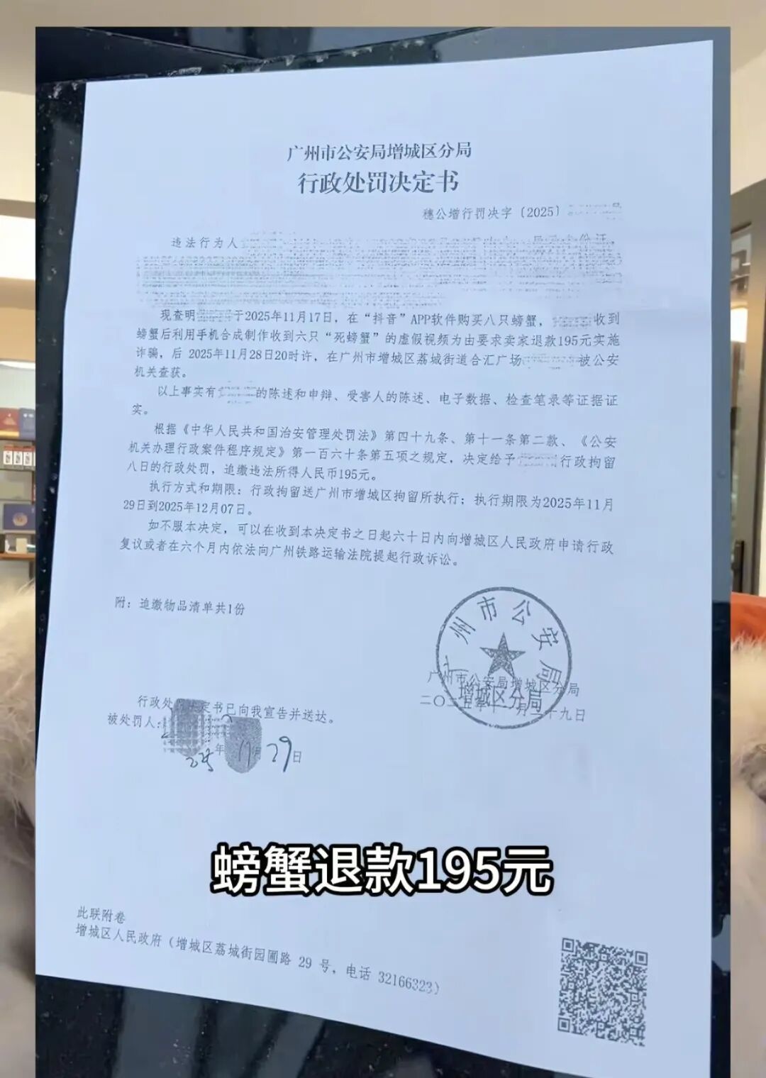 齐鲁晚报消息,12月2日,一位在江苏经营大闸蟹网店的高女士称,“螃蟹AI假图退款”事件有了最新进展:涉事顾客被行政拘留8日,索要的195元退款已经全额追回。