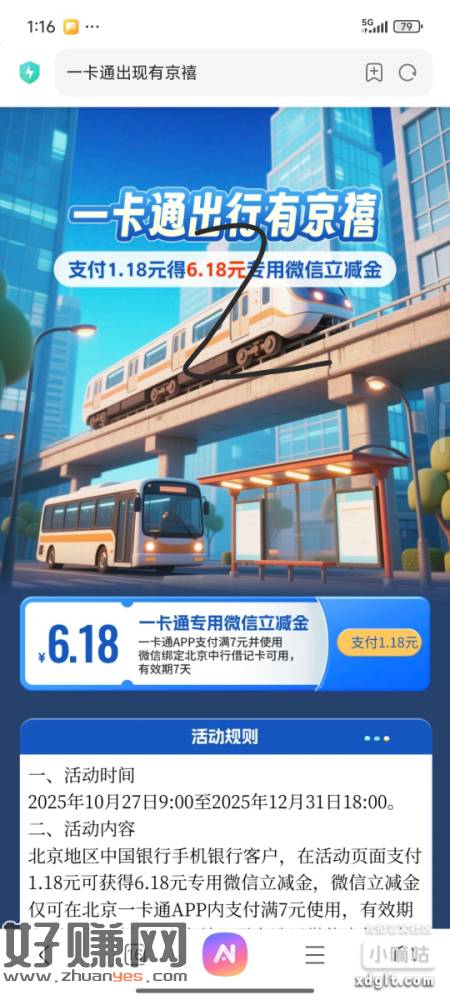 图二下载北京一卡通有个支付1.18满7减6.18的活动一块领取。