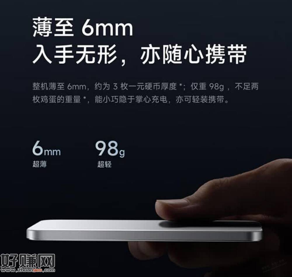 很薄,钛合金边框颜值高,要想续航久点估计要配个399元的小米充电宝才好用