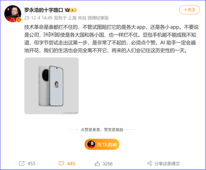 蚝腩讲这些是想说,创新是先于价值观形成的。这次豆包手机助手推出后,蚝腩第一时间就看到了一连串新闻。比方说“它会自己操作微信”,“你得完全交出自己的隐私+信任AI+愿意为AI的决策承担责任”。甚至有说字节是故意搞外挂,会方便灰产大军。