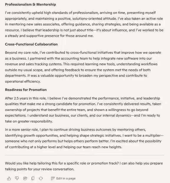 根据微软展示的案例,Copilot 成功梳理了员工的季度销售业绩、新流程开发的贡献以及导师辅导工作等核心亮点,确保这些容易被遗忘的“隐形贡献”被完整纳入年终考核中。