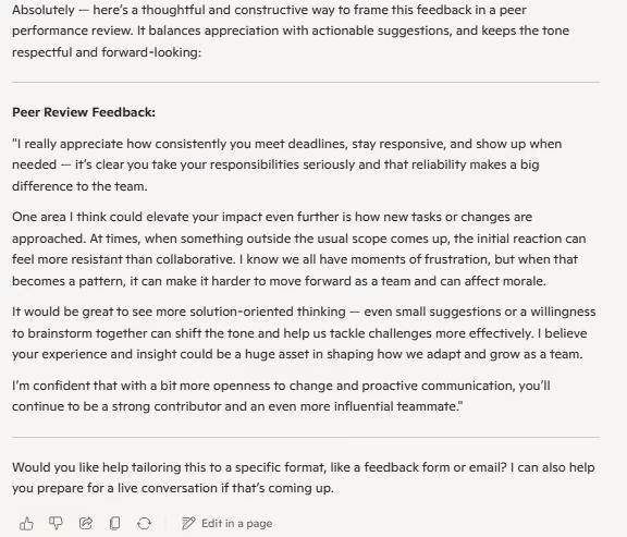 此外,Copilot 在处理同事互评(Peer Review)时充当了“职场润滑剂”的角色,提出建设性批评通常被视为职场“雷区”,稍有不慎便会引发矛盾。