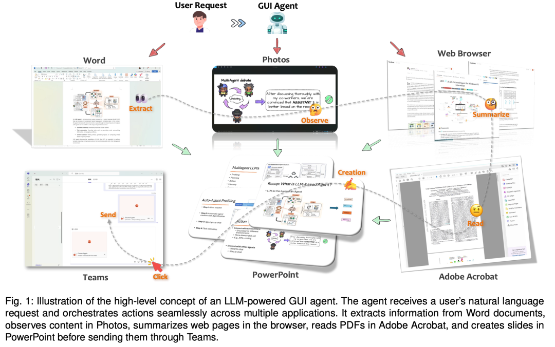 它会从文档中提取信息,在Photos中观察内容,在浏览器中总结网页,在Adobe Acrobat读取PDF,并在PPT中创建文件,最后通过Teams发送。