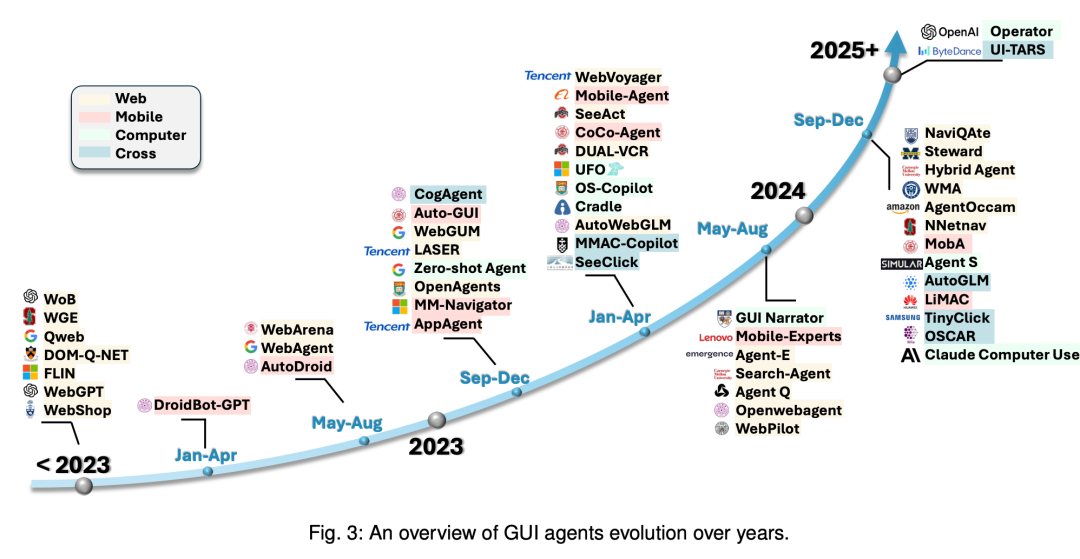 2023年之前,以OpenAI WebGPT为代表。从2023年之后,类似的GUI Agent全面爆发。