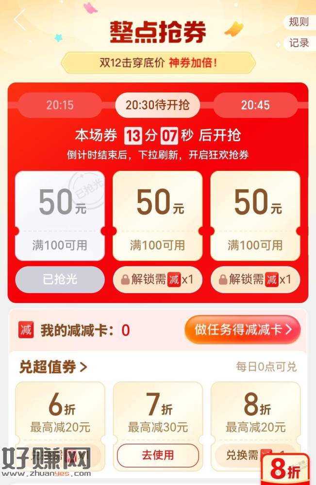 先浏览商品,拼多多APP,搜索,超级满减,点击整点抢券,点击兑超值券,做任务用1张减减卡兑换7折优惠券;拼多多APP,搜索,抽100,下单