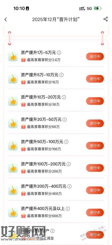 中行活动中心,晋升计划(全国),日均资产提升10w拿最高拿36w尊享积分。抽奖,低档是18w,可以买火车票,1w大概价值15,15×18=270,高档就是540部分人到20w变成理财客户,叠加领取100微信立减金,山东地区叠加财富升舱活动10w拿100立减金,潍坊地区叠加城市服务月月惊喜plus(可以自行看看当地有没有),10w给198立减金我这里几个活动叠加,10w抽奖高档就是540+100+100+198=938,低档是270+100+100+198=668