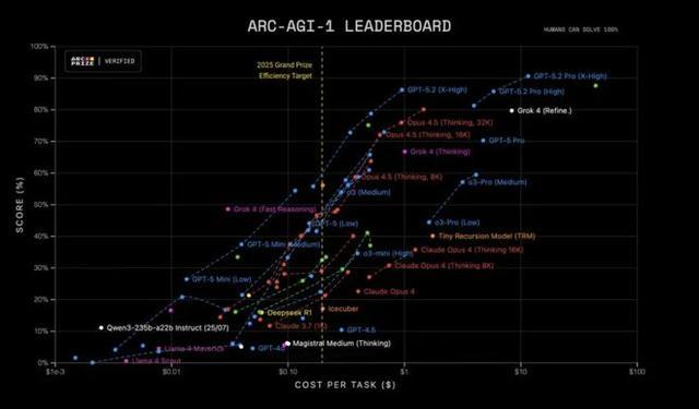 更牛的是,在 ARC-AGI-1 测试中,GPT-5.2 Pro 是第一个突破 90% 准确率的模型,相比去年 o3-preview 的 87%,表现更强,成本却降低了约 390 倍。