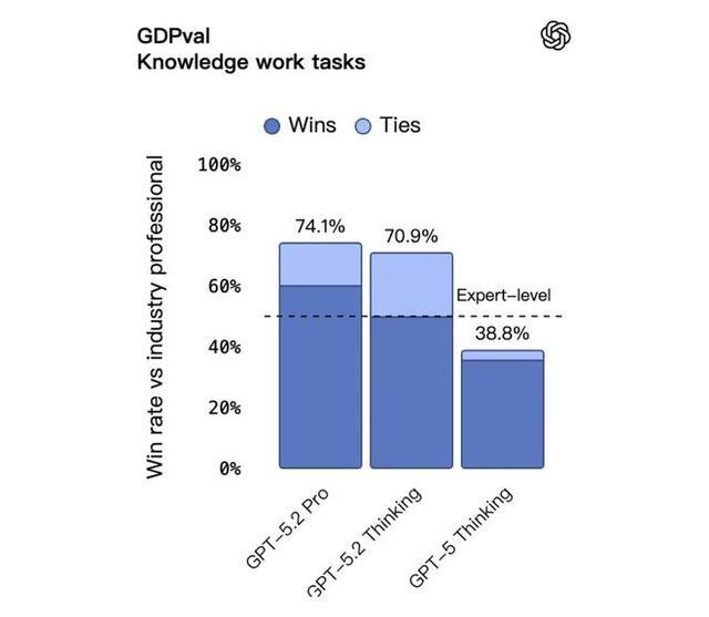 在评估 44 个职业知识型任务的 GDPval 测试中,它成为首个在总体表现上达到或超过人类专家水平的模型。具体来说,在与行业专家的对比中,GPT-5.2 Thinking 在 70.9% 的任务中胜出或持平,由人类专家亲自评判。