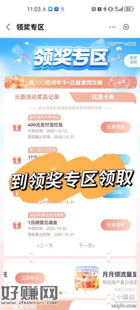 1️⃣ 到移动云盘-我的-活动中心-天降鸿运抽大奖