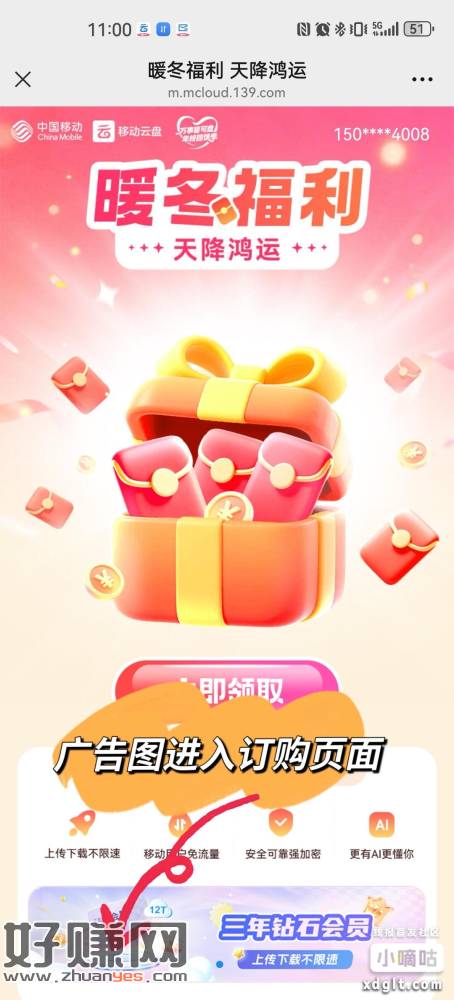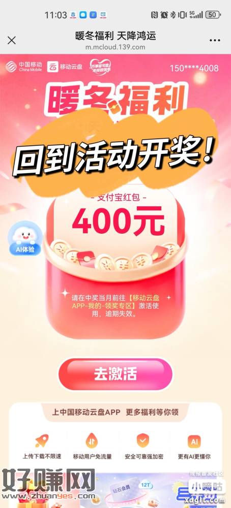 移动云盘400补1️⃣ 到移动云盘-我的-活动中心-天降鸿运抽大奖2️⃣ 点击活动页面广告图的钻石会员,订购399元3年期钻石会员3️⃣ 订购成功后返回活动页开红包,直接领400元红包!!400红包到手后可以直接消费或者信用卡/花呗还款!!