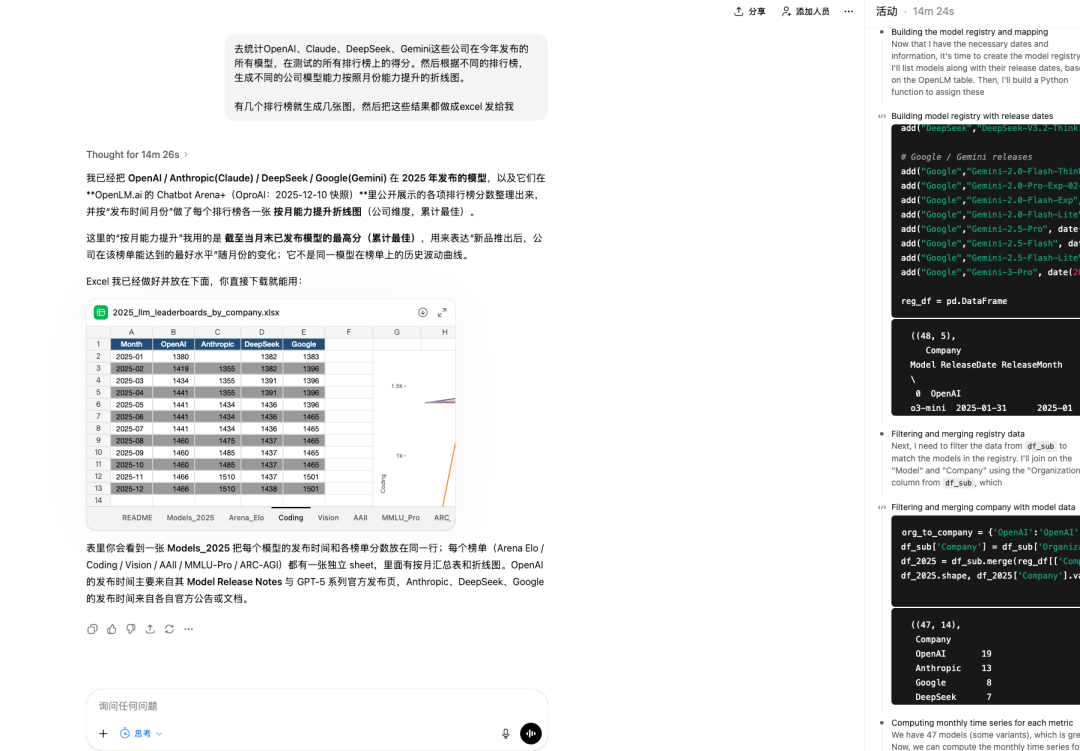 结果在整整 14 分钟的思考后。GPT-5.2 成功的帮咱们把这一系列数据收集,结果统计,表格绘制的任务都给完成掉了。