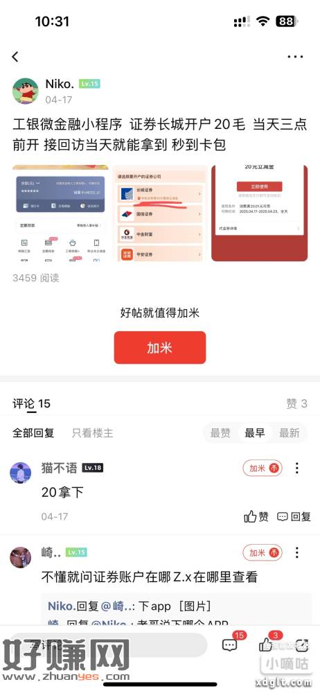分享大清毛 工银微金融小程序 证券国信开户20毛 当天三点前开 接回访当天就能拿到 秒到卡包 我以前开过 拿到直接Z.x证劵了 现在又有 我九点开的