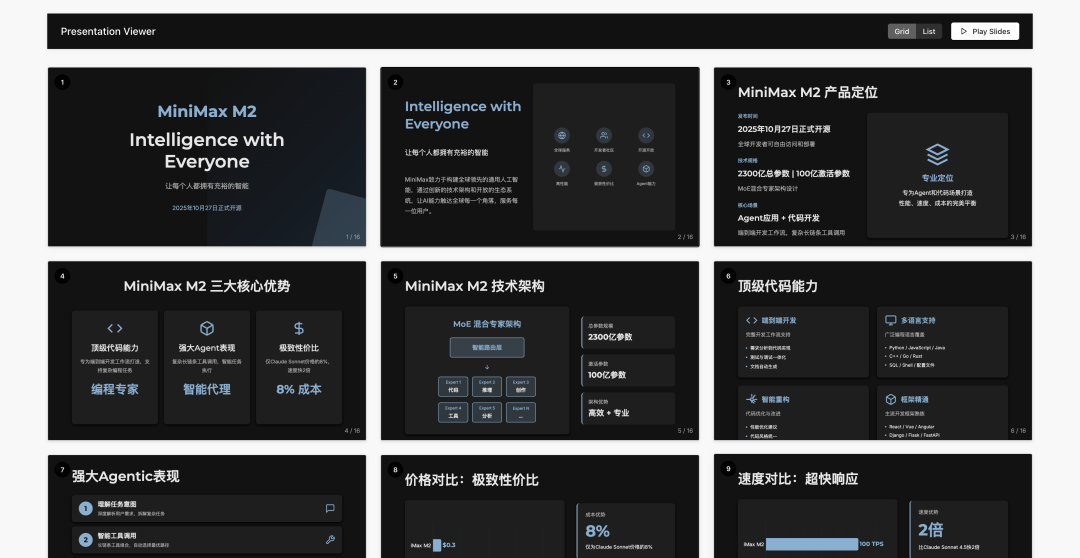 我们还让它去做一些深度研究,丢给它关于 M2 自己的信息,让它制作一个精美的 PPT。