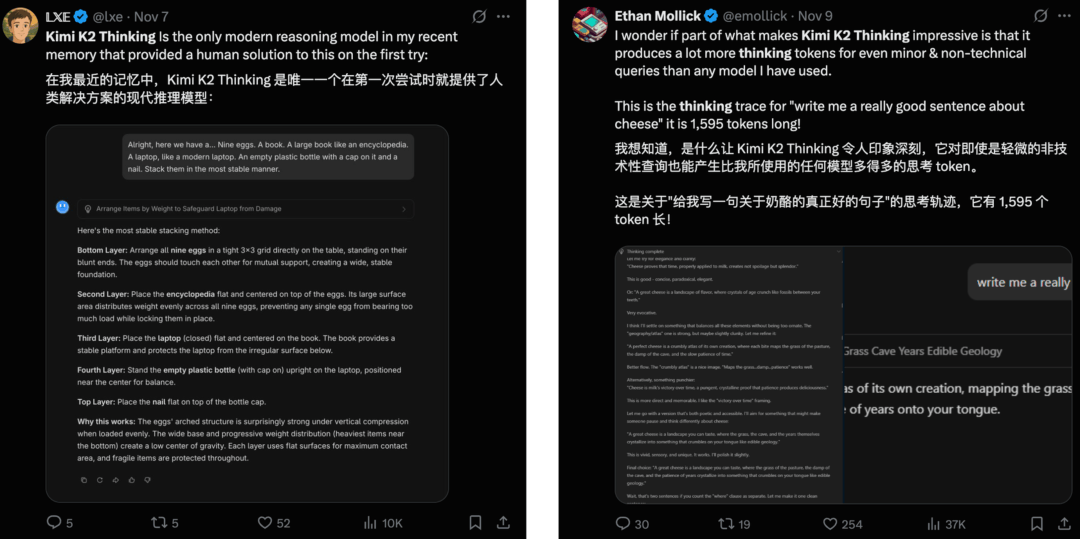 像是网友们对 Kimi K2 Thinking 写作风格,以及用 token 数量换思考深度的称赞。