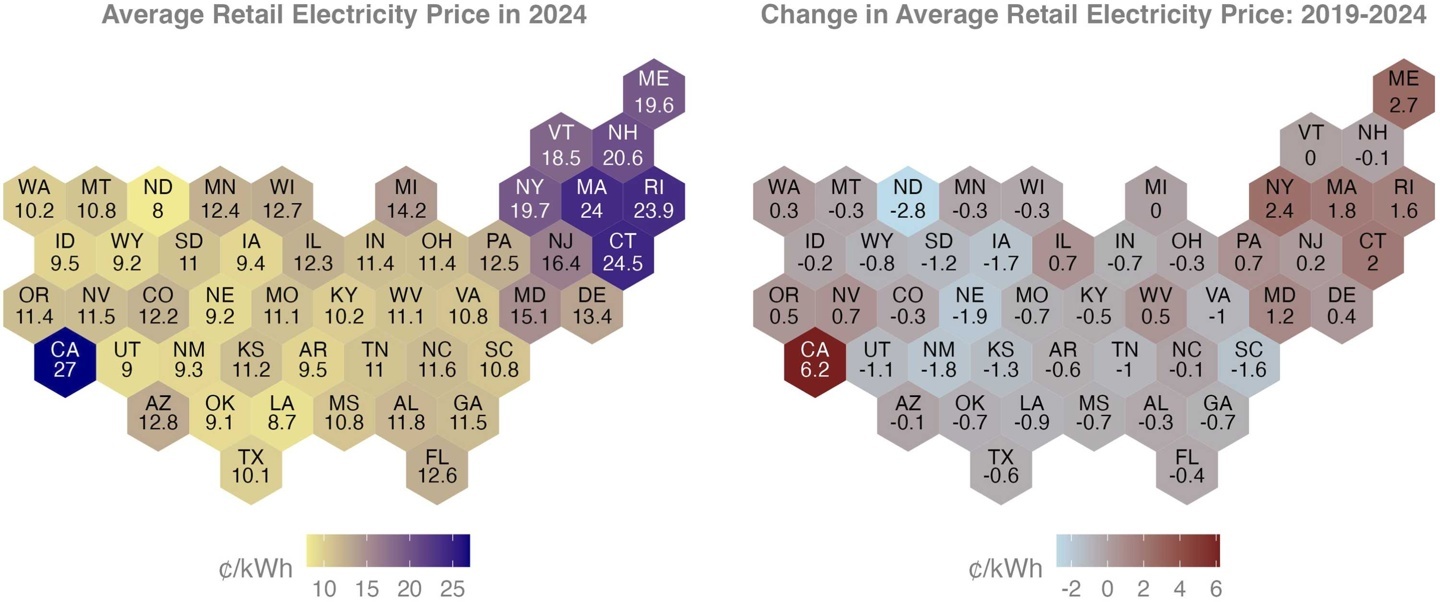 2024 年各州平均零售电价(左)和 2019 年至 2024 年经通胀调整后的价格变化(右)。