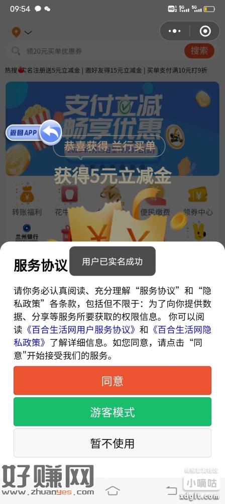 兰州银行最新领取5元立减金方法:下载百合生活app,点击领5元立减金按钮进去微信小程序,每个微信都要授权预留手机号码,点击实名,领取到了就Z.x,有时候不用实名也可以领,领不到Z.x,从app进就可以领,多微多领,领了5个v