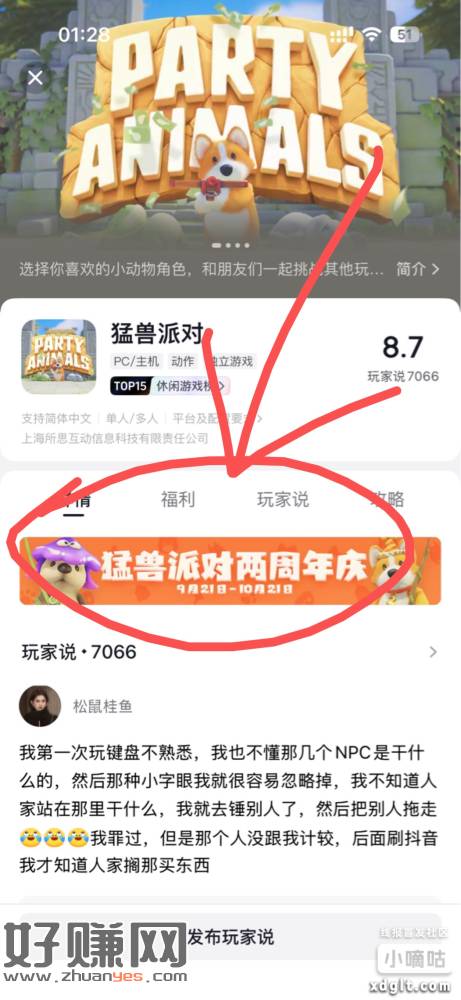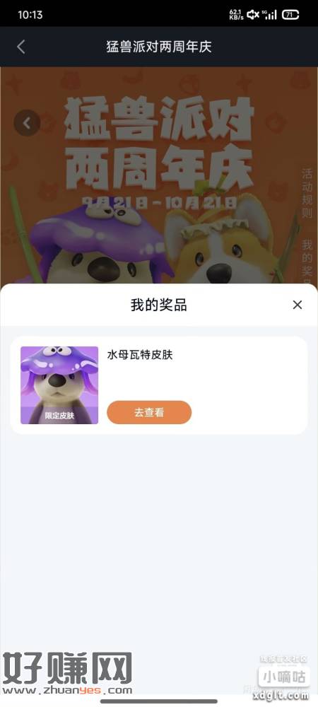 抖音搜索猛兽派对,点开账号游戏详情,横幅两周年庆,水母瓦特小毛