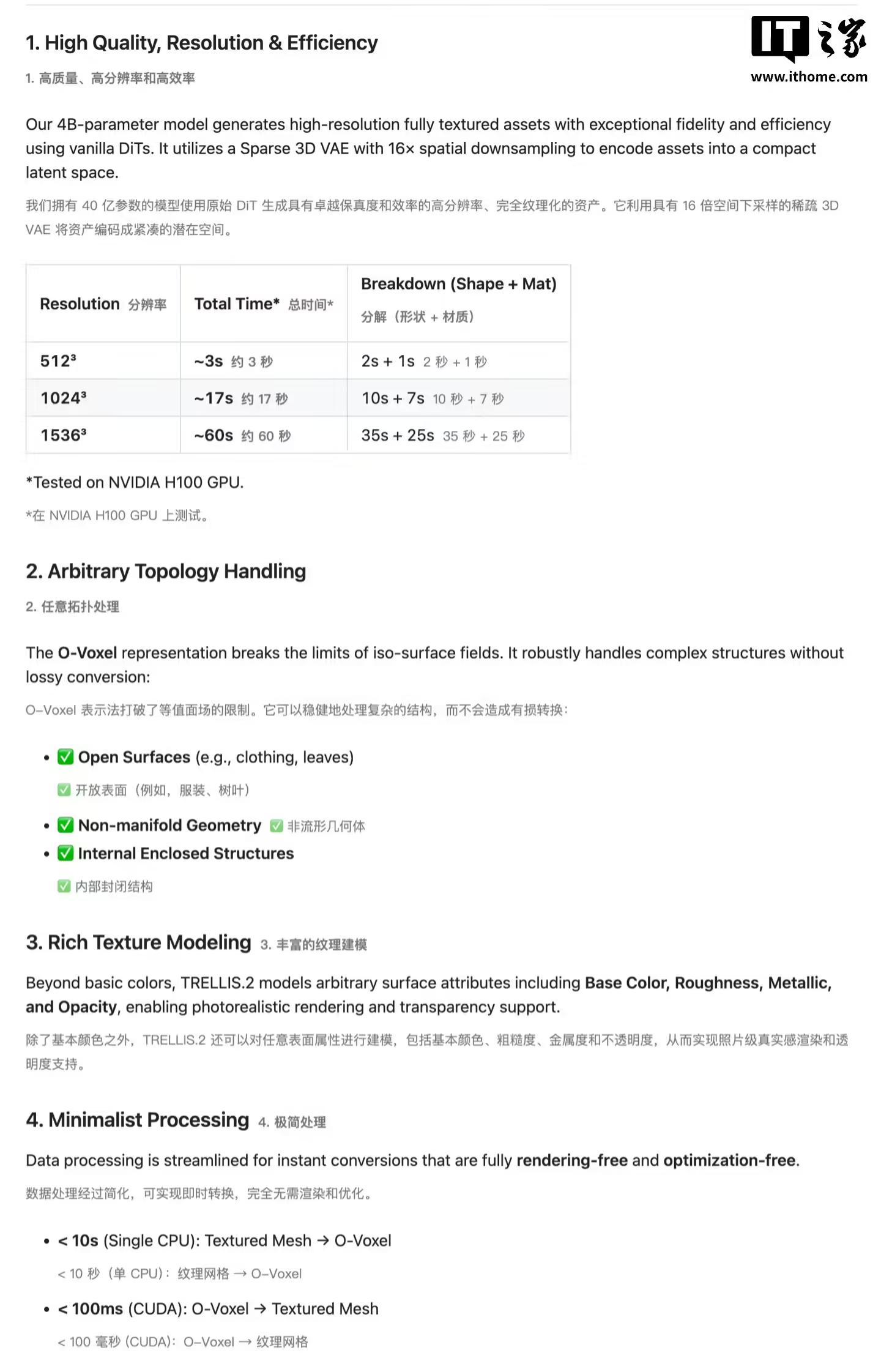 IT之家 12 月 18 日消息,日前,微软开源了最新的 AI 工具 ——TRELLIS.2,根据页面介绍,TRELLIS.2 是一个大型 3D 生成模型,具备 40 亿参数,专为高保真图像到 3D 生成而设计。其构建于原生 3D VAE 之上,可生成高达 1536³ PBR 纹理资产,具有 16 倍空间压缩,可实现高效、可扩展、高保真资产生成。