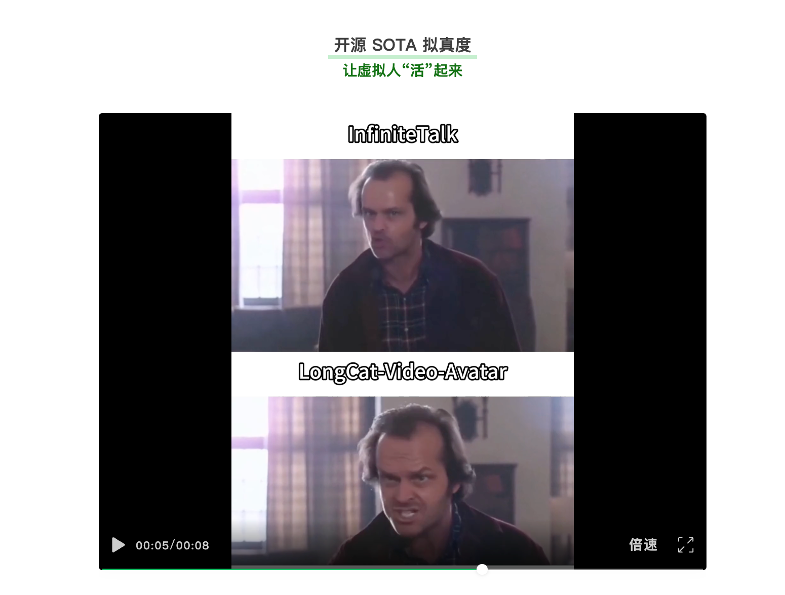 凤凰网科技讯 12月18日,美团LongCat团队正式发布并开源虚拟人视频生成模型LongCat-Video-Avatar。该模型基于其此前开源的LongCat-Video基座构建,支持通过音频、文本或图像生成虚拟人视频,并具备视频续写功能。