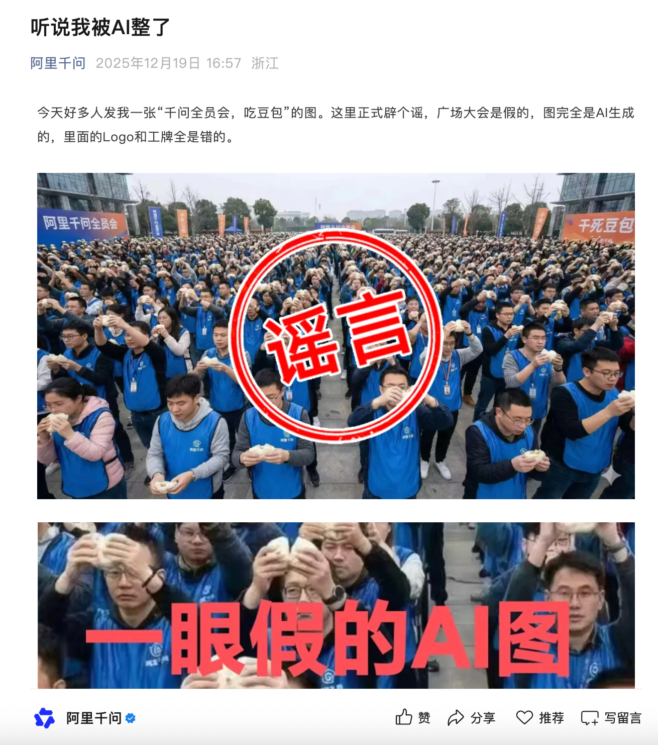 凤凰网科技讯 12月19日,阿里千问官方回应“千问全员会,吃豆包”:这里正式辟个谣,广场大会是假的,图完全是AI生成的,里面的Logo和工牌全是错的。并表示,“也不知这张图是哪位的杰作,大家都是干AI的,相煎何太急啊。”