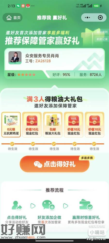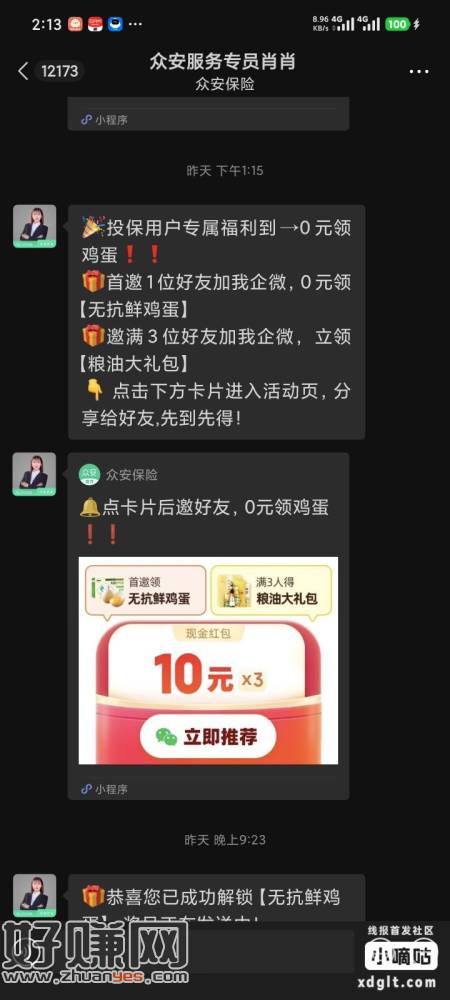 好毛我只在晚上偷着发前两天众安保险集卡50那个活动,参加了买保险的,看看有没有资格参加这个活动,拉5个人加好友,30元子+鸡蛋+粮油礼包,加上那天那个活动相当于9.9换80+一堆东西了,链接没头,我拉满了已经