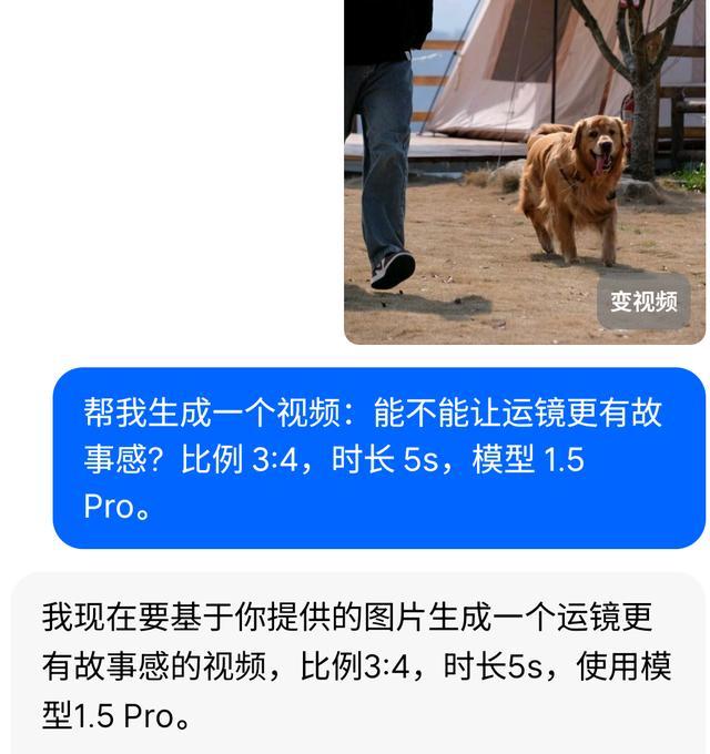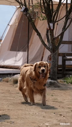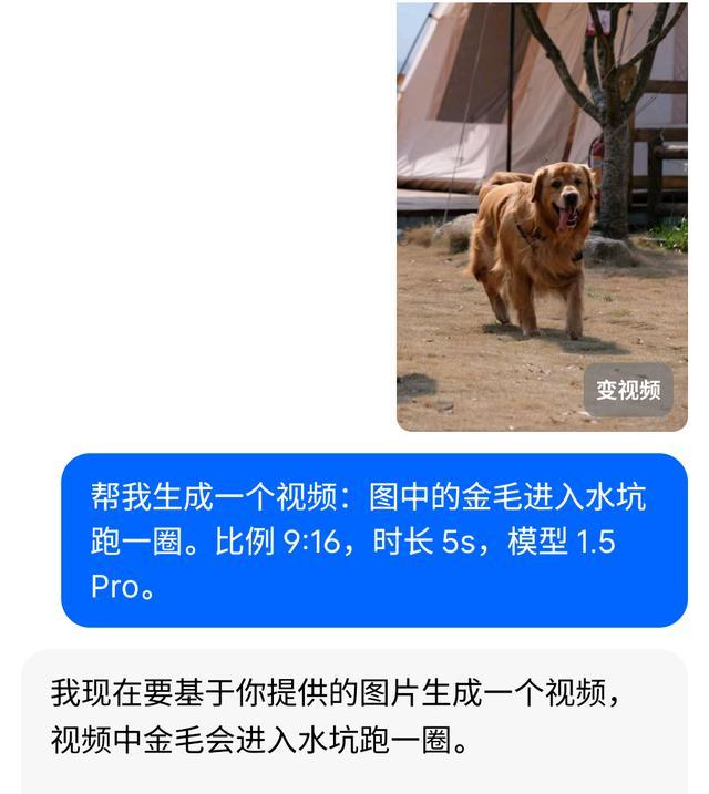 我们丢给它一张火锅近照,并直接跟豆包讲:“让图中的金毛进入水坑跑一圈。”