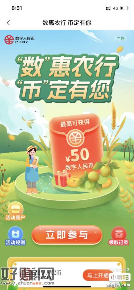 农行数币红包农行App-城市专区-位置切换到江门-往上拉到底-月月礼•每月抽红包-付1元参与活动抽数币红包(1元支付后会退回)中了10块。